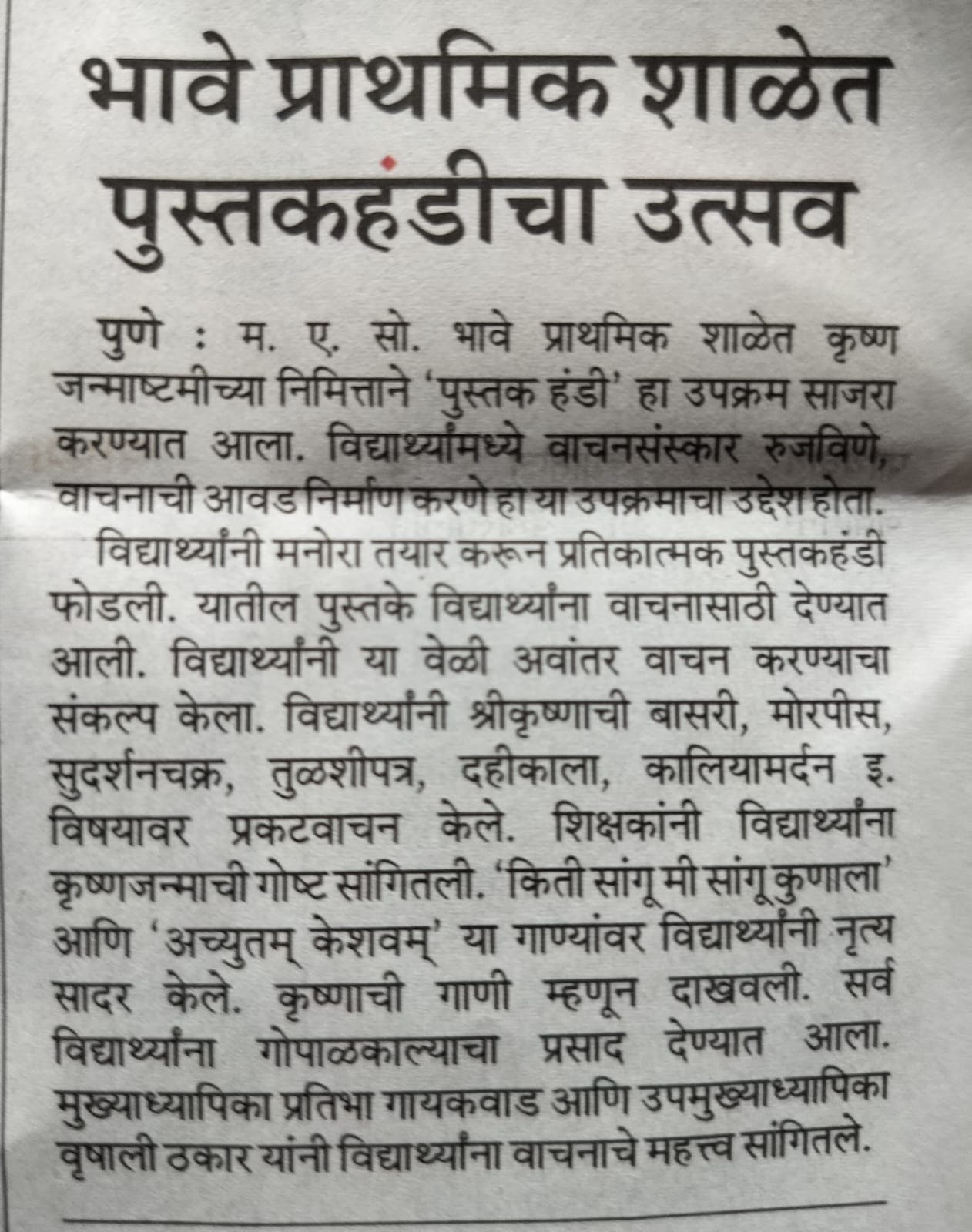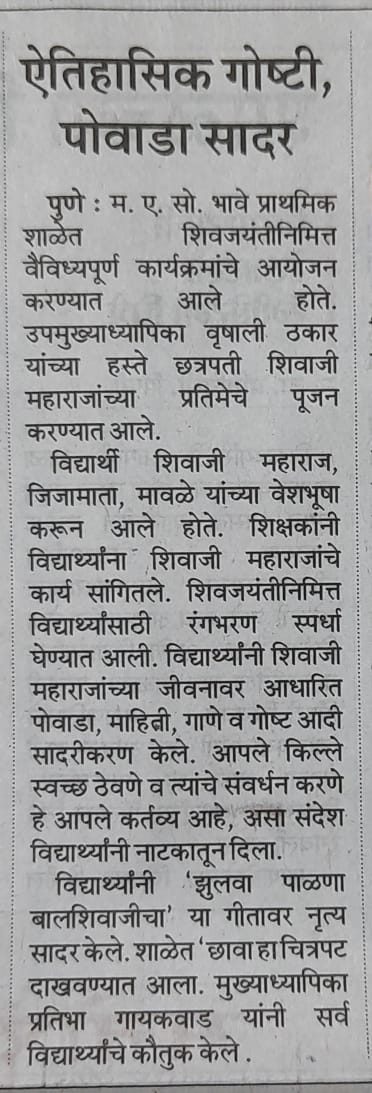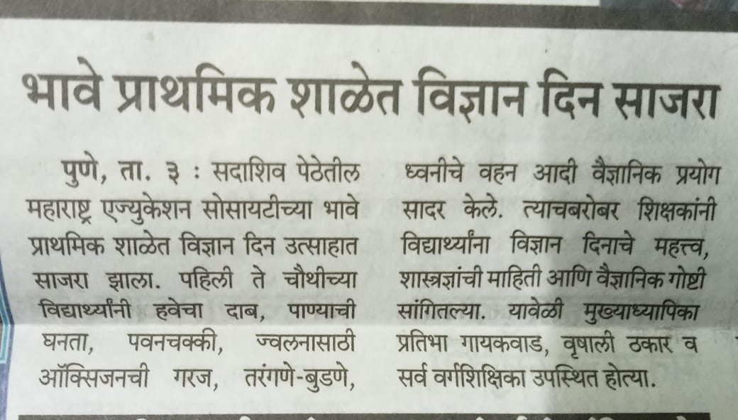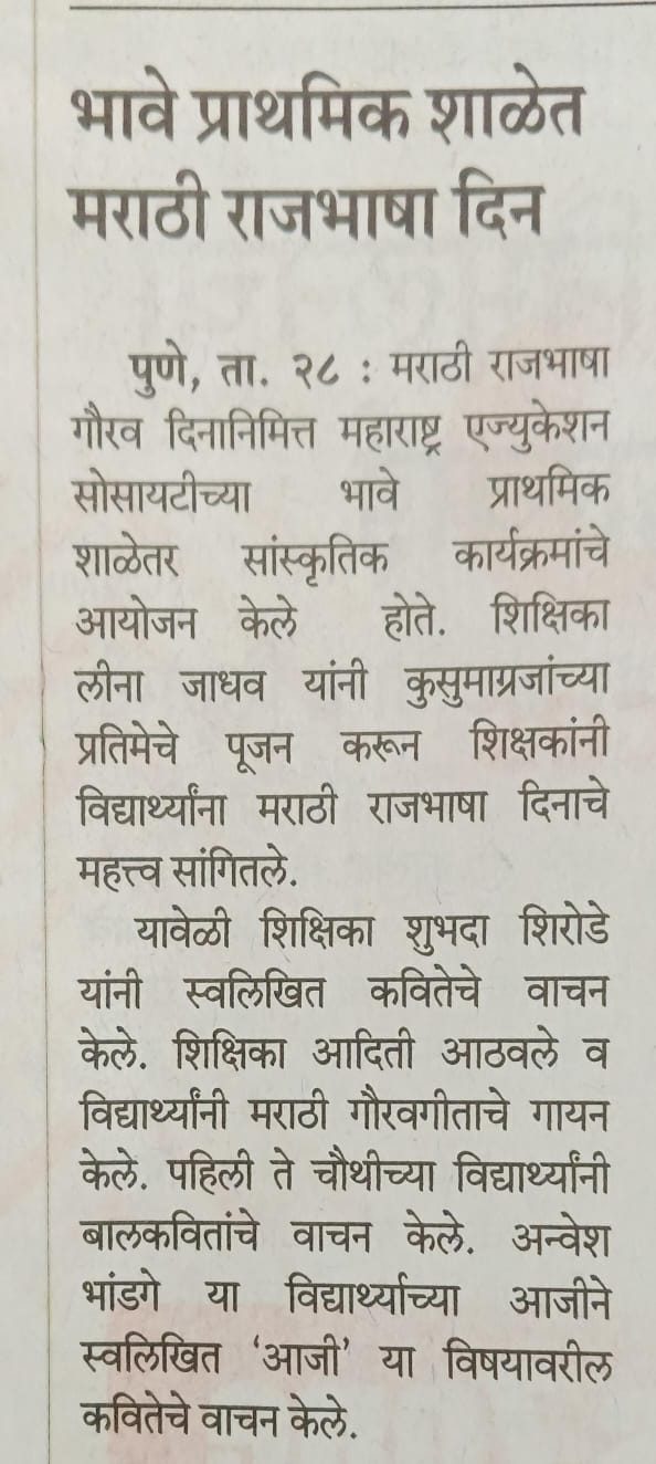 म.ए.सो.बालशिक्षण ,डेक्कन आयोजित ‘व . पु .काळे कथाकथन स्पर्धेत ‘भावे प्राथमिक शाळेची विद्यार्थिनी कु.मानसी आमडेकर हिने कथाकथनाचा प्रथम ‘व.पु.काळे पुरस्कार ‘मिळविला आहे . या स्पर्धेत ५० स्पर्धक सहभागी झाले होते . या विद्यार्थीनीला सहशिक्षिका रेणुका महाजन यांनी मार्गदर्शन केले होते . मा.मुख्याध्यापिका सौ . प्रतिभा गायकवाड , मा.उपमुख्याध्यापिका सौ . वृषाली ठकार यांनी मानसीचे कौतुक केले.