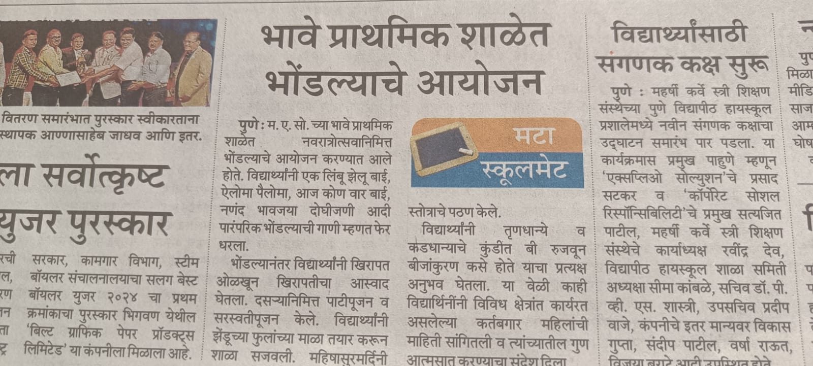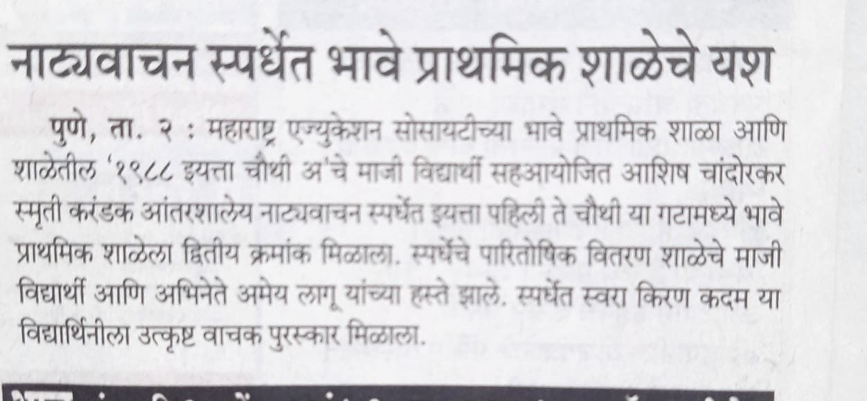 महाराष्ट्र एज्युकेशन सोसायटीची भावे प्राथमिक शाळा , पुणे आणि १९८८ इ . ४ थी अ चे माजी विद्यार्थी सहआयोजित आशिष चांदोरकर स्मृती करंडक आंतरशालेय नाट्यवाचन स्पर्धेमध्ये इ. १ ली ते ४थी या गटामध्ये म . ए . सो . भावे प्राथमिक शाळेला तृतीय क्रमांक मिळाला आहे .या स्पर्धेत इ.४थी आदित्य गटातील कु.मानसी आमडेकर या विद्यार्थीनीला उत्कृष्ट वाचक पुरस्कार मिळाला आहे . या सर्वांना सहशिक्षिका श्रीमती रेणुका महाजन यांनी मार्गदर्शन केले होते . मा.मुख्याध्यापिका सौ . प्रतिभा गायकवाड , मा.उपमुख्याध्यापिका सौ . वृषाली ठकार विजेत्या विद्यार्थ्यांचे कौतुक केले.