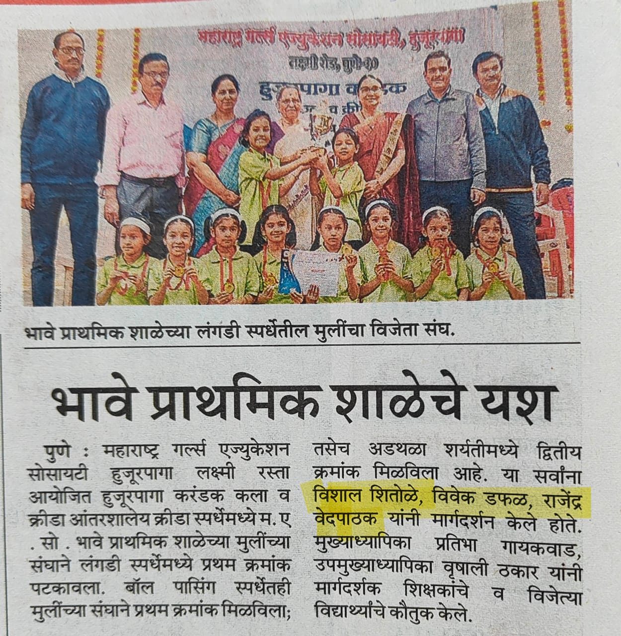 एम व्ही एम परांजपे मराठी प्राथमिक विद्यालयाच्या वतीने घेण्यात आलेल्या “लोकनृत्य स्पर्धेमध्ये” अ गटामध्ये १९ संघ उपस्थित होते यामधून महाराष्ट्र एज्युकेशन सोसायटीच्या भावे प्राथमिक शाळेला तृतीय क्रमांक मिळाला आहे. विद्यार्थिनींनी गोंधळ ( लख्ख पडला प्रकाश ) या गीत प्रकारावर नृत्य सादर केले. नृत्य दिग्दर्शन सौ.श्वेता कोंडे व सौ.वीणा शिंदे यांनी केले होते . मा.मुख्याध्यापिका सौ . प्रतिभा गायकवाड , मा.उपमुख्याध्यापिका सौ . वृषाली ठकार यांनी विद्यार्थीनींचे कौतुक केले.